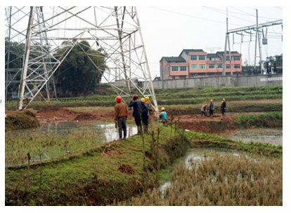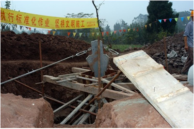 圖六:四川省強(qiáng)波電力工程有限公司在2005年承建的東觀500KV變電站220KV出線金南線工程,圖為該工程N(yùn)88號鐵塔正在按標(biāo)準(zhǔn)化作業(yè)進(jìn)行基礎(chǔ)澆灌施工。