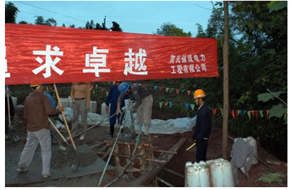 圖一:四川省強(qiáng)波電力工程有限公司在2005年承建的東觀500KV變電站220KV出線金南線工程,圖為金南線N80#鐵塔基礎(chǔ)澆注施工。